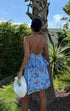 Vestido ligero con estampado floral en tonos azul y blanco, adornada con bordados coloridos y orilla con detalles dorados brillantes. Un diseño elegante y fresco, ideal para ocasiones especiales o looks bohemios con estilo único.